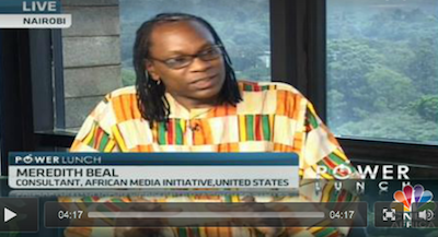 Nairobi, Kenya – CNBC Africa's “Power Lunch” host Bonney Tunya talks with renowned broadcaster and Sr. Technology Advisor with the African Media Initiative Meredith Beal about investment in entertainment in Africa. The African broadcast and film industry is evolving quickly, driven by demand and a need to tell the continent's story. Beal has been consulting several governments including Kenya, Rwanda & Benin on creative economy legislation. Beal formed an alliance between the African Media Initiative -- the continent's largest umbrella organization of media owners and FEPACI -- the Pan African Federation of Filmmakers, which has a membership of over 1,000 filmmakers in 40 countries. Beal joins CNBC Africa to discuss the emerging opportunities.